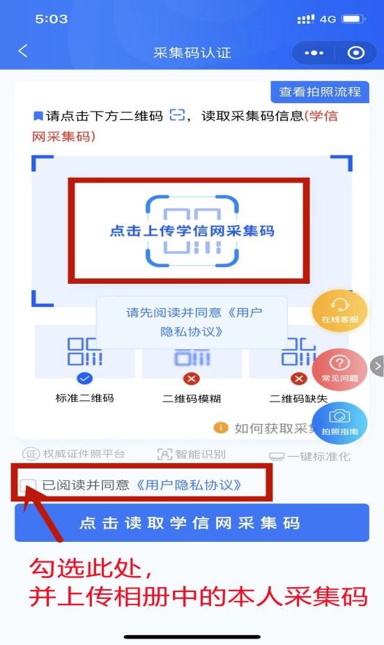 4. 缴费后,观看拍照指南,按小程序步骤,上传手机相册中已有的半身证件照或自助拍摄,完成采集。
