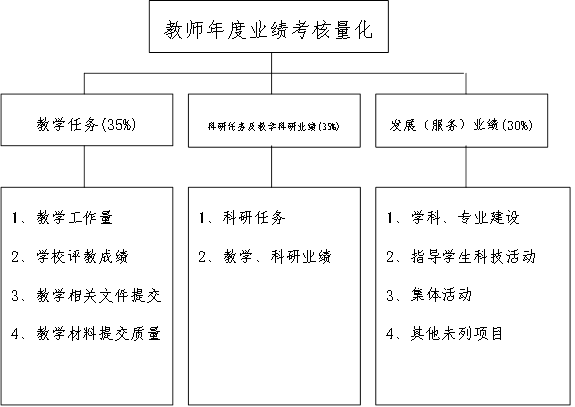 3、根据公司相关考核办法及公司的实际情况,该考核分配方案按专任教师、行政、教辅和辅导员4个考核组分别进行考核,切块分配。专任教师考核以定量考核为主,行政等其他人员以定性考核为主。考核时间从每年的12月1日始,至第二年的11月30日止。