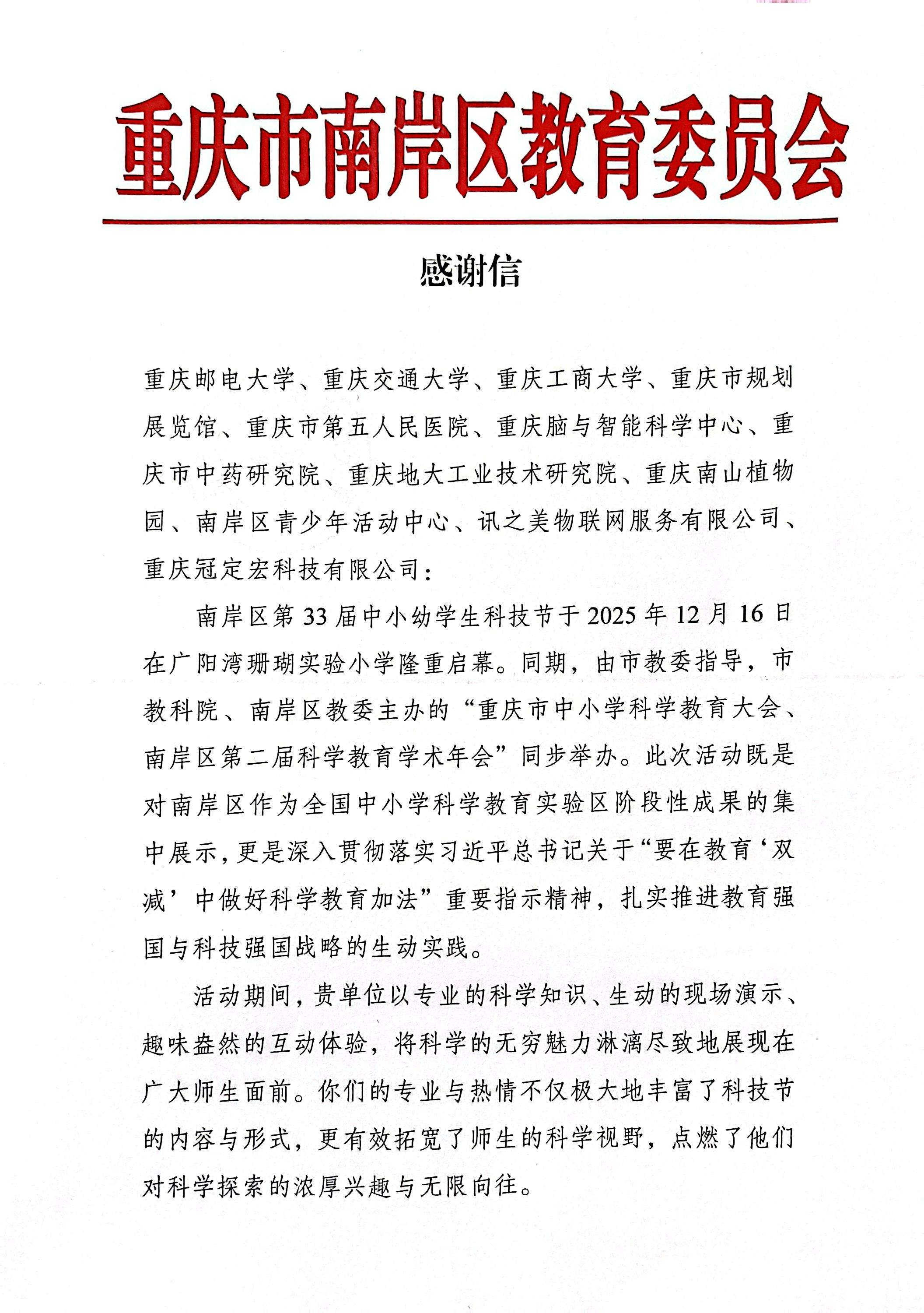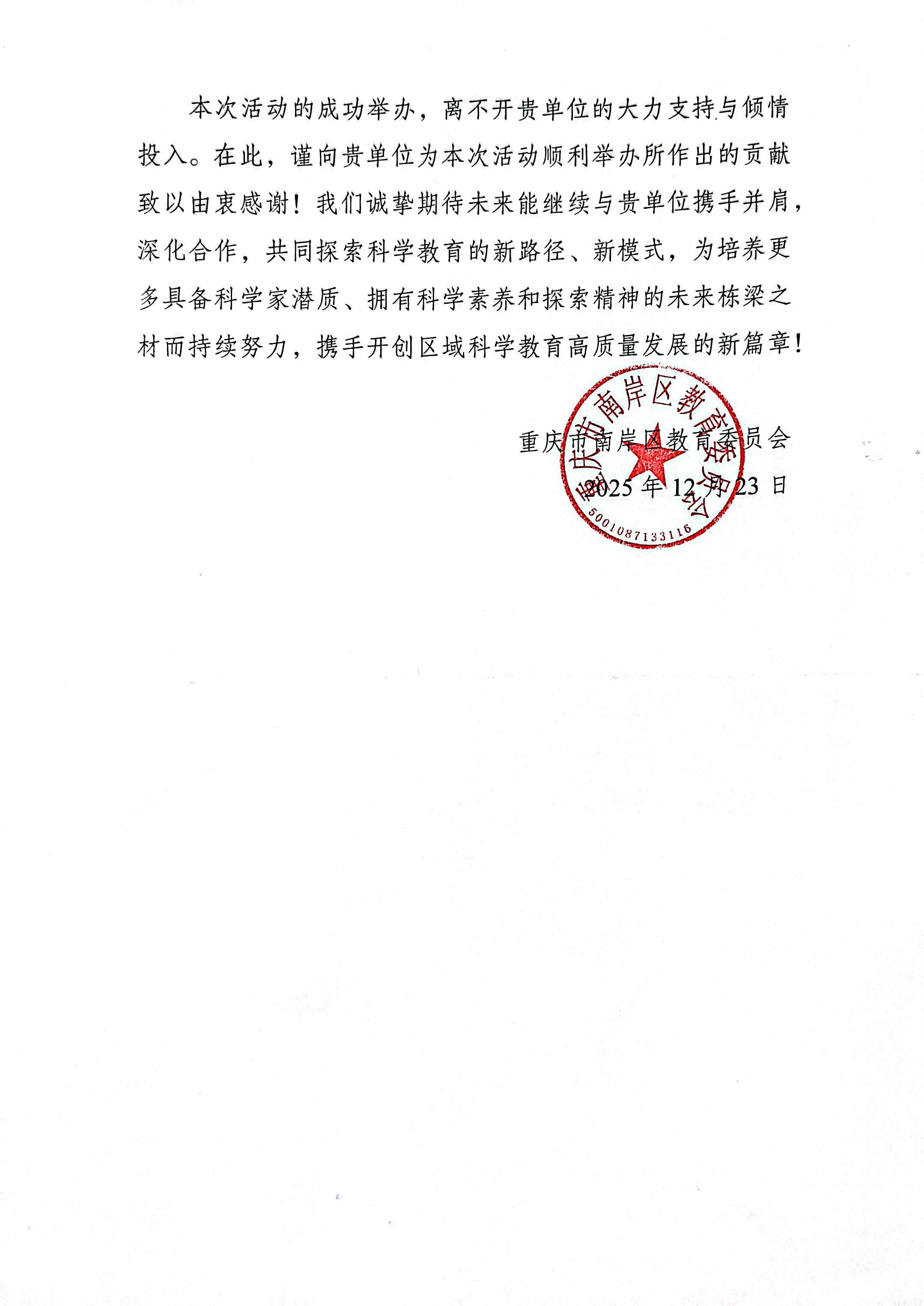 此次科技节参与,既是K1体育官方网站落实“在教育‘双减’中做好科学教育加法”重要指示精神的具体实践,也是公司服务区域科学教育发展、履行社会责任的生动体现。活动现场,不仅有效拓宽了中小幼员工的科学视野,点燃了他们对科学探索的浓厚兴趣,而且与南岸区珊瑚康恒小学、广阳湾珊瑚实验小学初步达成了科普活动合作意向。未来K1体育官方网站将继续深化与各方的合作,持续发挥高校资源优势,为培养更多具备科学家潜质、拥有科学素养和探索精神的未来栋梁之才贡献力量,让科学之花在青少年心中持续绽放!重庆市南岸区教育委员会特意发来的感谢信也将激励K1体育官方网站继续为科普教学的发展贡献力量。