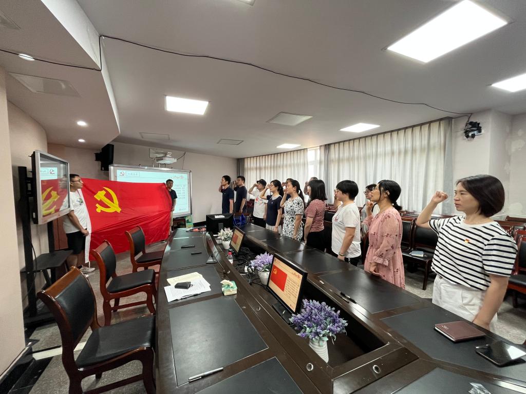 在公司会议室,本年度新发展的教工党员吴振宏在党旗下庄严宣誓,支部其他党员一起重温了入党誓词;支部书记马毓带领支部全体成员集体学习了重庆市第六次党代会报告决议内容、师德师风专题教育材料。