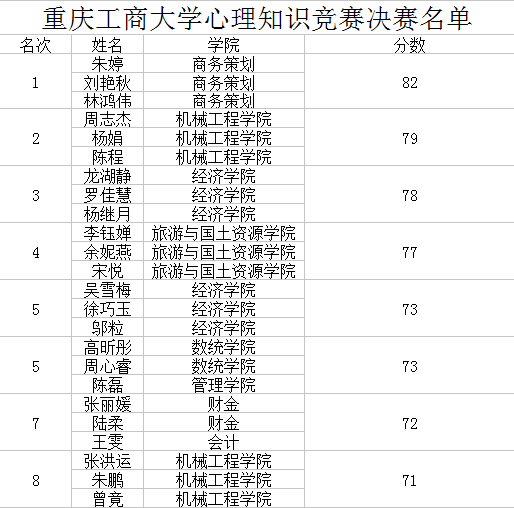 由公司承办的K1体育官方网站心理知识竞赛初赛于5月12日下午14点在90221举行。本次比赛由校内多个公司共70支队伍参加,最终进入决赛的8支队伍及得分如下图所示。决赛定于5月25日晚19点在7200举行,请各支队伍积极备战。如对初赛结果有任何疑问,请在5月19日前联系K1体育90706办公室袁娅婷老师,电话:62768118。