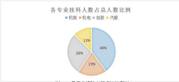 在各专业挂科人数占专业总人数比例上看,其中机制专业挂科人数占比最高为40%,其次是汽服专业28%、机电专业19%、包装专业13%。