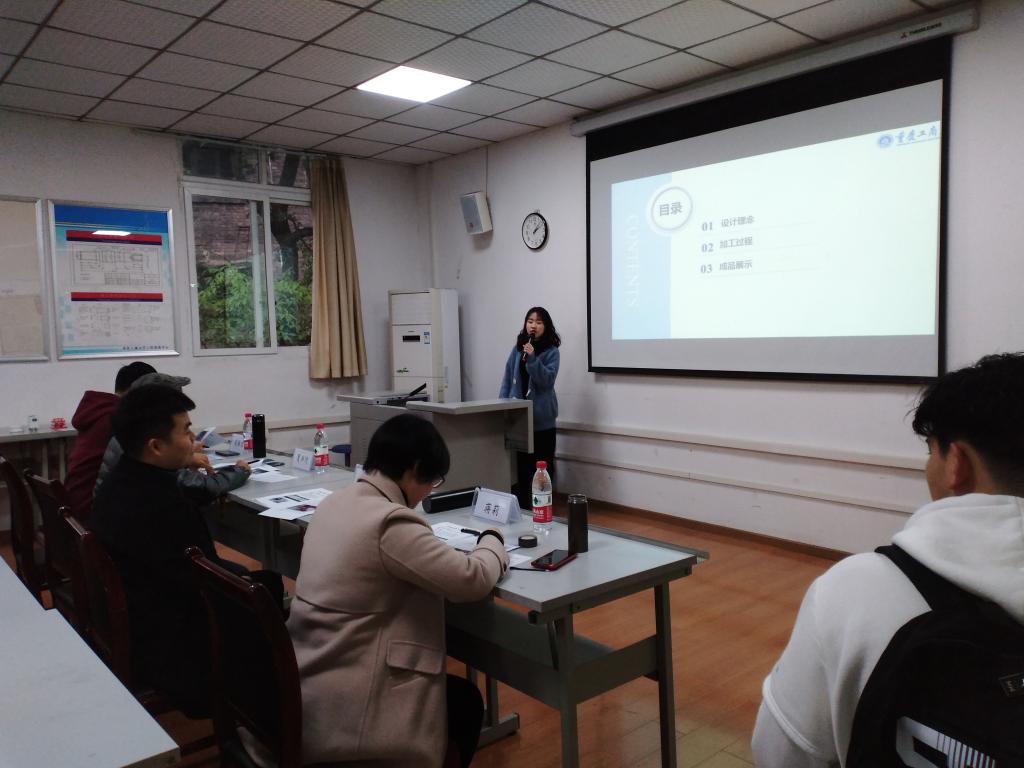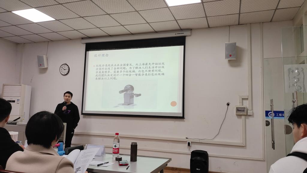 此次大赛主要以答辩的方式进行,由吴振宏、蒋莉、张建恒、夏洪均四位老师担任评委。此次参加的共有17个小组,每个组的作品都各有特点。本次有三个参赛作品都是以垃圾分类为话题来制作的相关的物品,他们也在此次比赛中都名列前茅。其中罗群小组的“分类垃圾桶”在此次比赛中获得第一。比赛时,参赛选手详细地为四位老师讲解了他们的作品。同时,每个小组还对自己作品的不足进行了总结,并提出了相应的改进方案。每组的答辩时间为5分钟,答辩内容包括功能特点、创意来源和设计思路等等。答辩结束后,每个组都和老师们进行了交流,让老师们更加的了解了他们的作品,方便了老师对他们做出评价。在与老师们的交流过程中,参赛选手们也有不少收获。