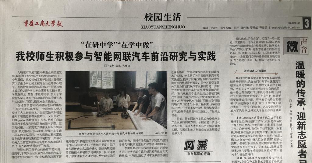 2020年暑期,公司社会实践团成员组队积极参与教师的前沿研究,引发媒体关注,继《重庆日报》全媒体平台报道后,近日,《K1体育官方网站报》以《“在研中学”“在学中做”公司师生积极参与智能网联汽车前沿研究与实践》为题对此进行了深度报道。