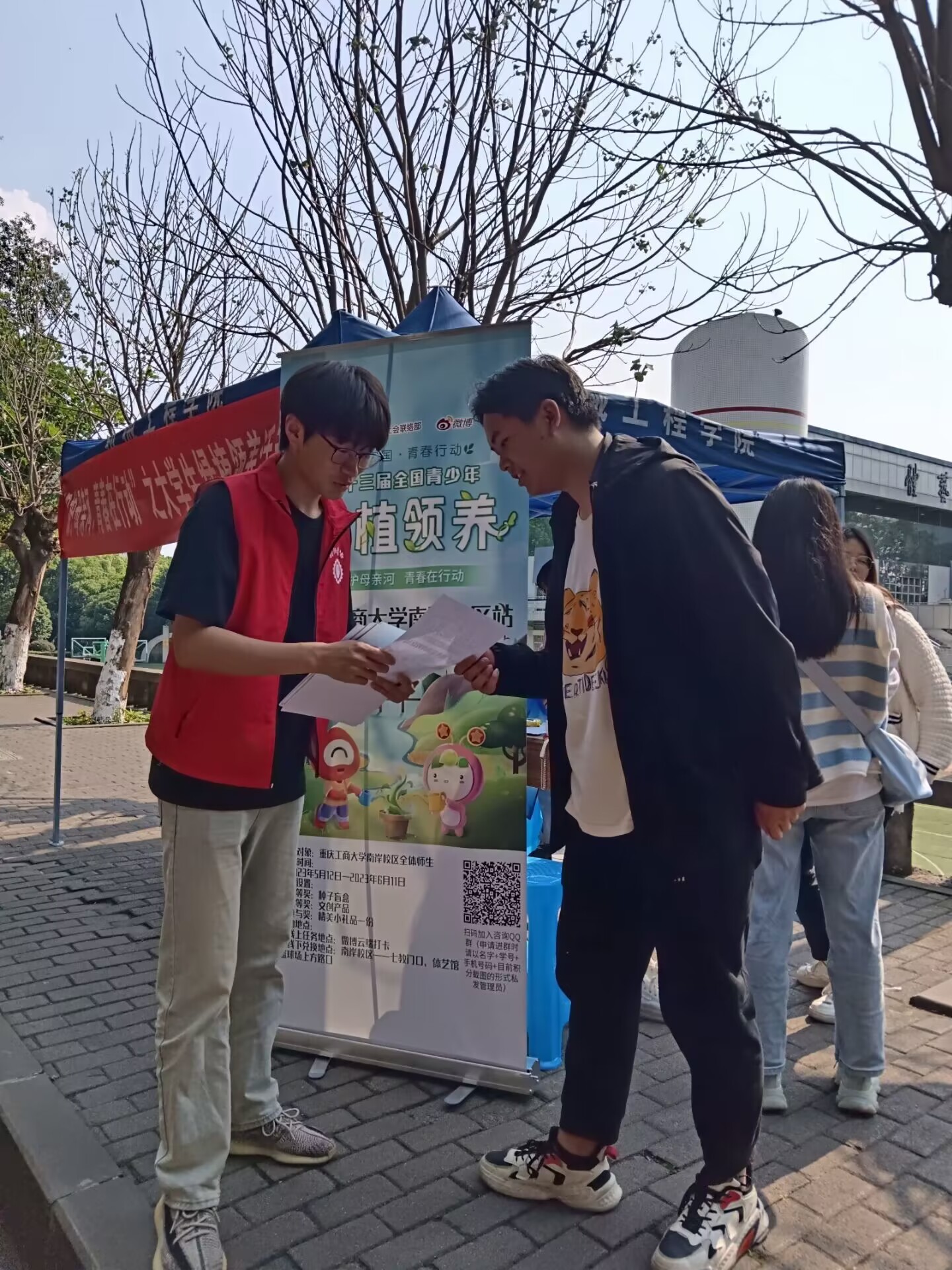 为响应国家保护母亲河的措施,号召更多人参与守护母亲河,2023年5月12日,K1体育、经济公司在南岸校区南操体艺馆旁联合开展"绿植领养,保护母亲河,青春在号召"的主题宣传活动.