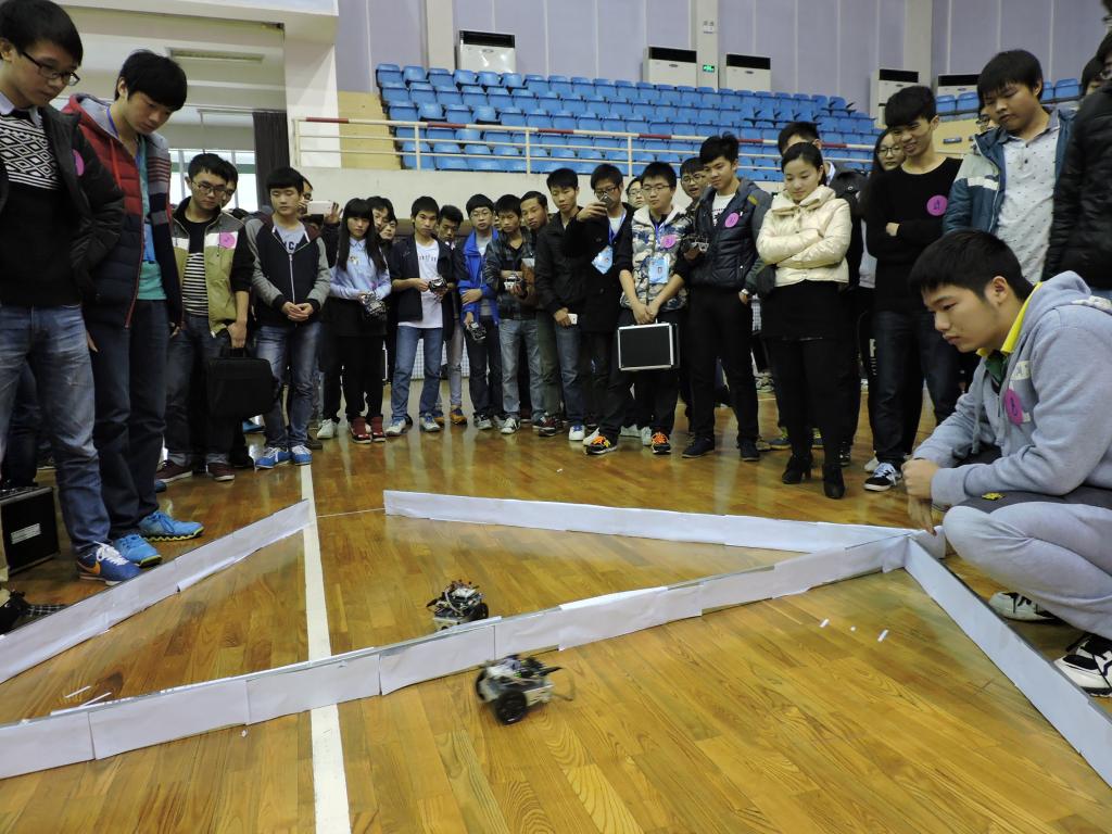 在“无碳小车”比赛的同时,“龙人宝贝”机器人的比赛也在激烈进行中。“龙人宝贝”机器人也是员工自行设计组装、自行编程实现其运动和蔽障功能的机器人。每组两个“龙人宝贝”同时比赛。参赛选手将“龙人宝贝”放置在指定位置,要求“龙人宝贝”寻找出口“逃生”,用时最短者为胜利方。有的“龙人宝贝”走出五角星路线,有的同学把“龙人宝贝”设计成了遥控车。经员工组装编程后的“龙人宝贝”在比赛中八仙过海,各显神通。