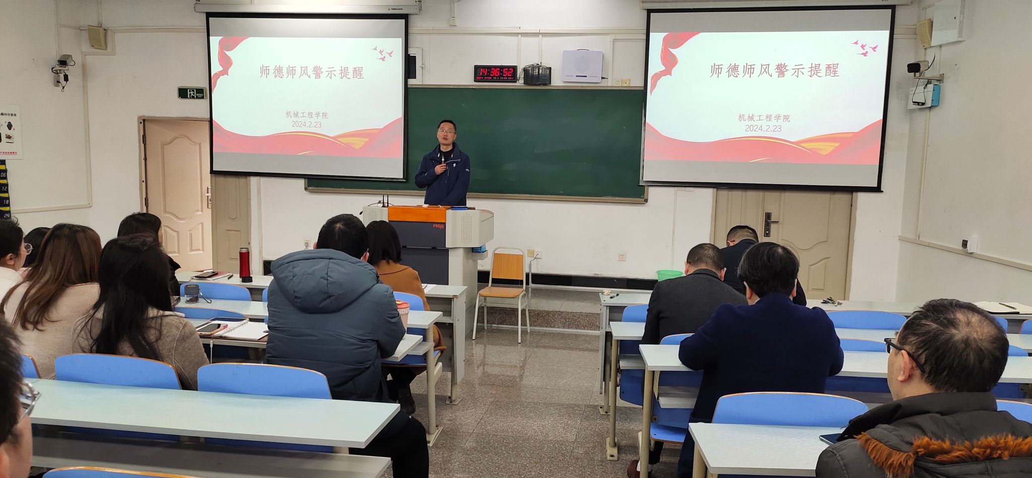 公司经理杜力深入剖析了典型案例,引导全体教职工以案为鉴,以案明纪,进一步强化师德师风底线意识和敬畏意识,积极践行新时代高校教师职业行为十项准则,切实维护教师良好形象,牢记教书育人使命,践行新时代师德规范。