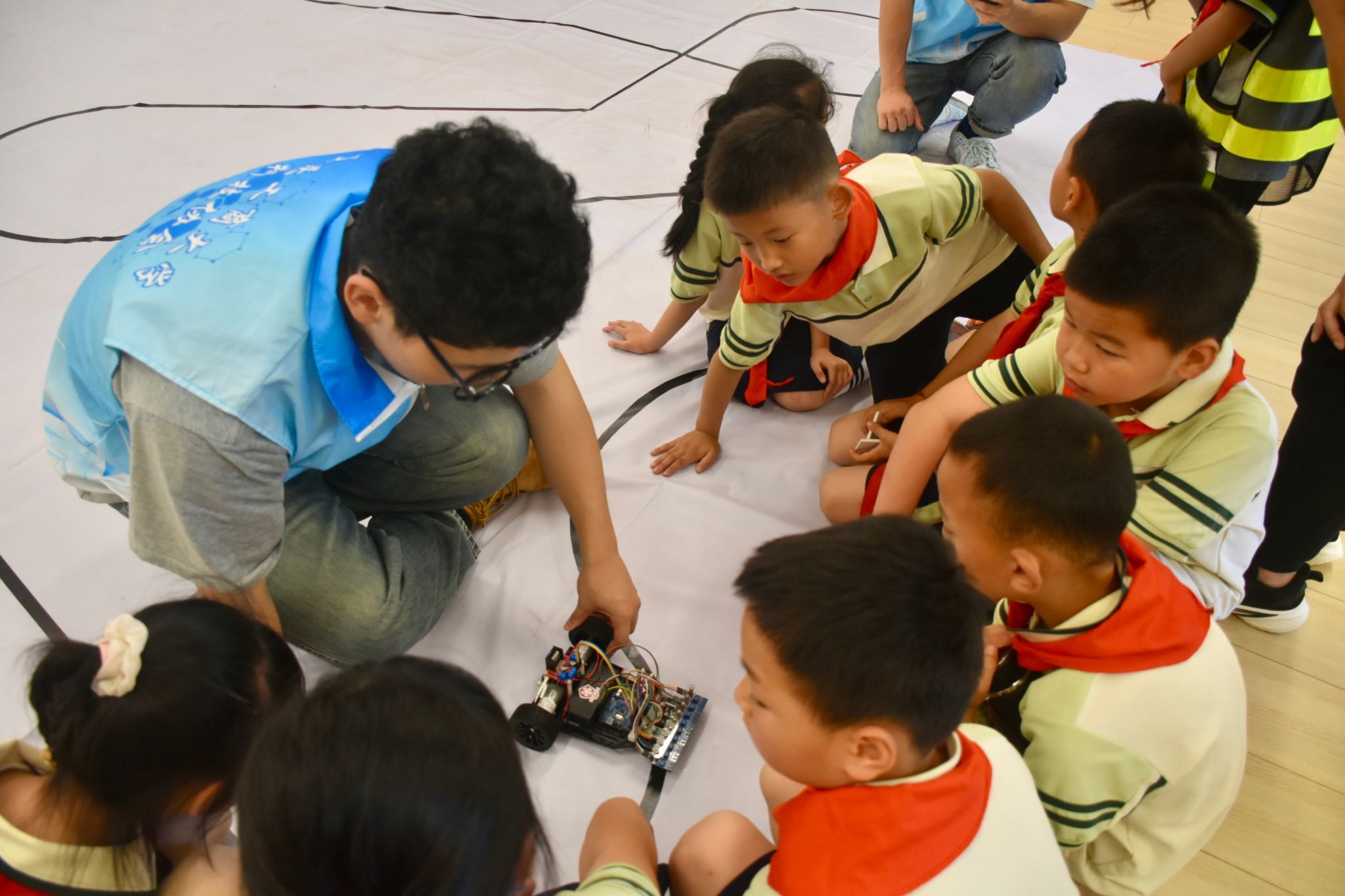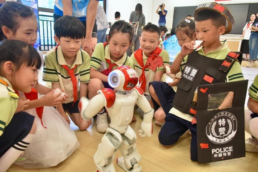 活动现场,小朋友们在老师的组织下有序分组,迫不及待地走进书法室,瞬间被眼前新奇的科技展品所吸引。志愿者们化身 “科技导游”,用通俗易懂的语言,为小朋友们详细讲解每个科技项目的原理与功能。从循迹小车如何通过传感器感知周围环境到实现自主行驶;从 3D 打印如何将虚拟模型变成实体物品,到 NAO 机器人灵活的动作与智能交互,小朋友们听得全神贯注,一双双眼睛里闪烁着对科技的好奇与向往。