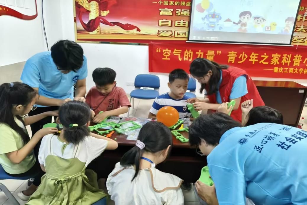 空气动力实验课堂,实践团成员谭焱楠用气球、塑料瓶等材料组装的动力车吸引了不少孩子。他演示气球充气后释放、推动小车滑行的过程,讲解反作用力原理,并组织“谁的小车跑得更远”的小竞赛。孩子们专注地调整气球大小和车轮角度,即使脸上沾了灰尘也浑然不觉,沉浸在动手实践的乐趣中。