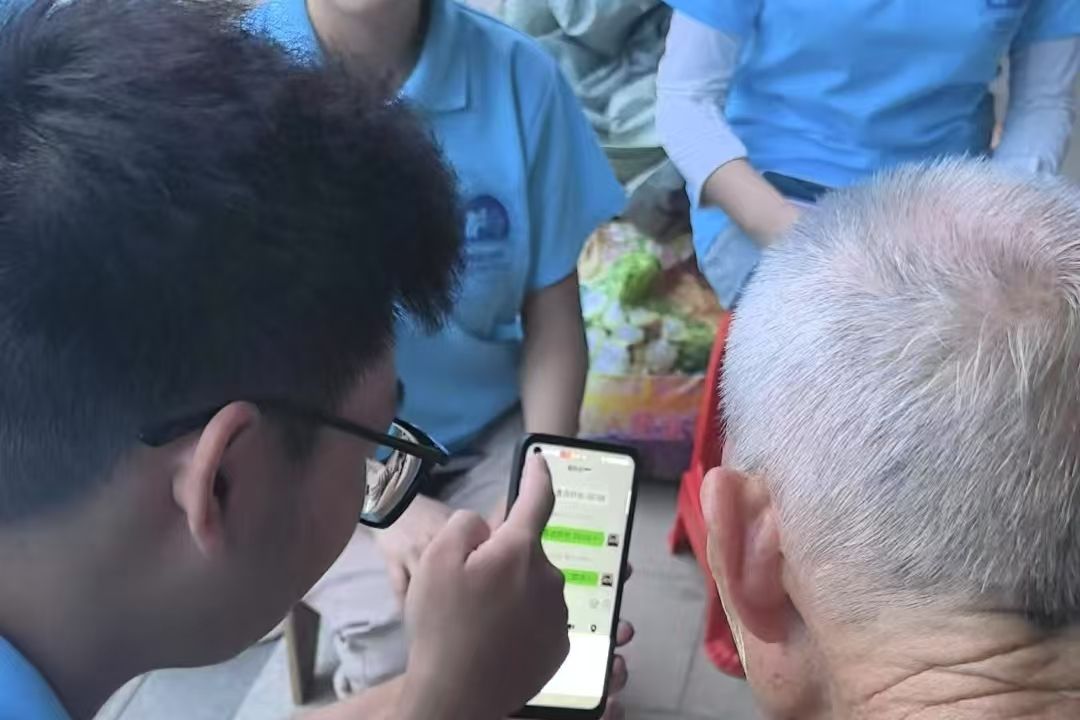 最热闹的要数电子产品教学环节。两个老人围坐在一起,手中紧握着手机,眼神里满是好奇与期待。实践团成员们拿出精心准备的教程,从最基础的开机、解锁讲起,一步一步耐心演示。“郁爷爷,您看,点这个绿色的微信图标,再选择你儿子的对话框就能和您儿子聊天啦。”成员小陈手把手地教着一位老爷爷,边说边用手指轻轻点着屏幕示范。遇到学得慢的老人,他们也从不急躁,反复讲解、多次操作,直到老人完全掌握。在志愿者的帮助下,老人们逐渐跨越数字鸿沟,解锁智能生活的新乐趣。