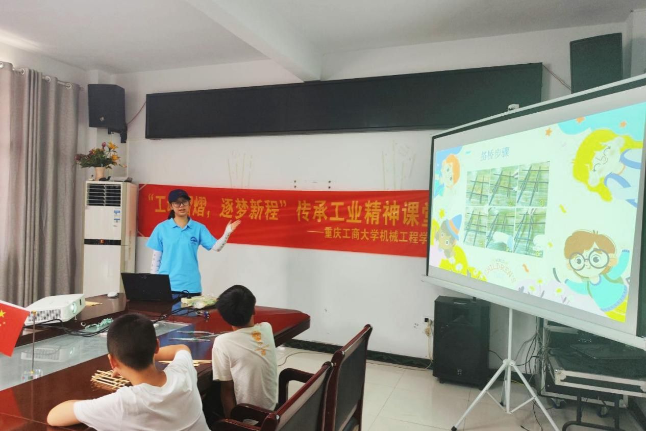 活动最后一日上午,“工魂熠熠,逐梦新程”活动中,团队在高古镇小朋友带来工业精神科普:通过工业发展小故事与趣味动画,讲解艰苦奋斗、创新创造等核心要素;组织筷子桥搭建、气球反冲车制作等实践活动,引导小朋友展示成果、分享感悟,带动家长关注工业知识,推动乡村科普文化建设。