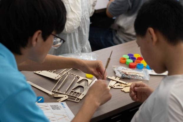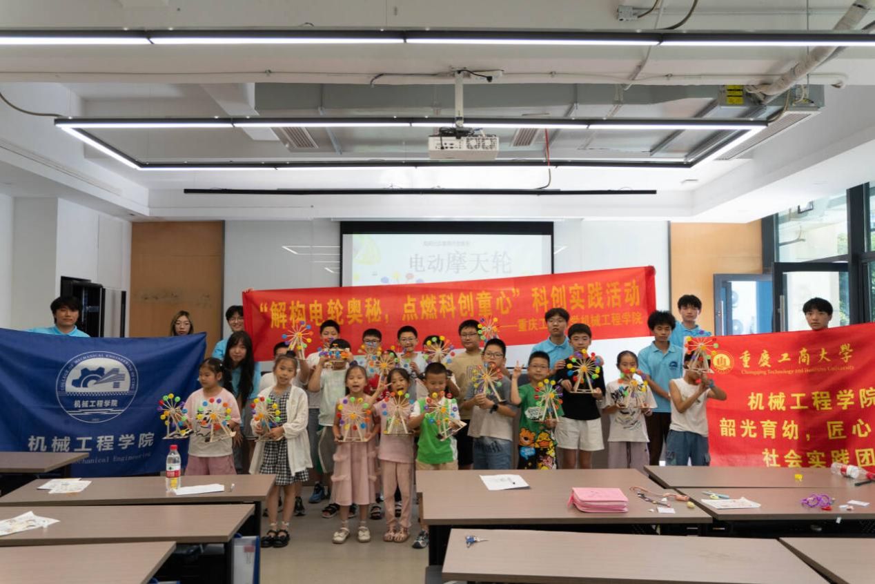 实践团成员提前准备了充足的制作材料:雪糕棒、竹签、电机组件、胶水、木棍等,并组装了一个成品摩天轮作为示范。活动开始前,成员们向孩子们介绍了摩天轮的基本结构:由支架、轮盘、底座三部分组成,通过电机传动实现转动。“大家仔细看,转动这个小齿轮,大轮盘就会跟着转起来,这就是机械的力量。”成员们一边演示,一边用简单的语言解释齿轮传动的原理。