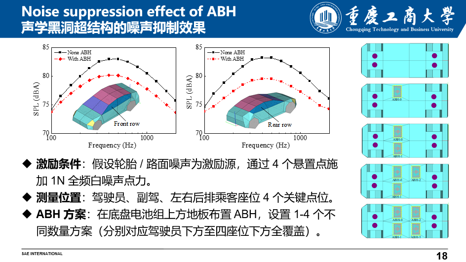 仿真结果显示,ABH结构在实际应用中成效显著。通过在车辆地板布置1至4个ABH单元,研究团队在白噪声激励测试中观察到300–800赫兹频段降噪效果尤为突出。其中,仅布置4个ABH结构,前排噪声最高就可降低3.7分贝,后排最高降低2.8分贝,且每增加一个结构可额外实现0.4–0.5分贝的降噪增益,展现出该技术的广泛适用性。