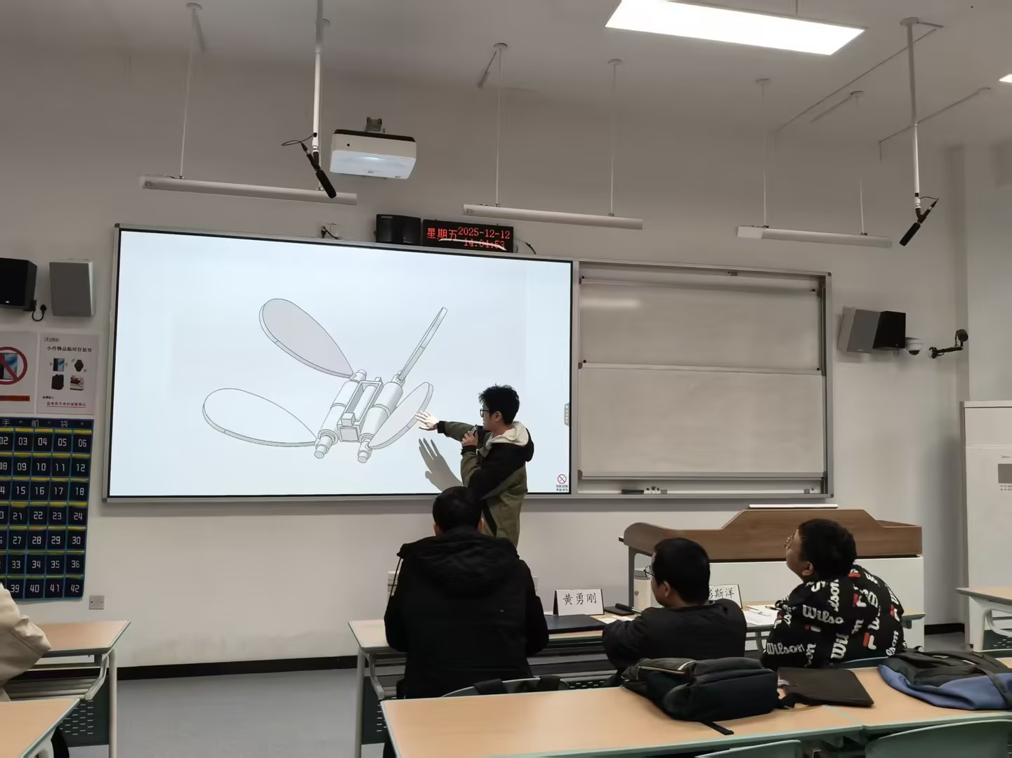 决赛答辩现场,各参赛团队依次上台,通过PPT演示、实物原理展示、现场答辩等形式,全方位讲解作品的创意理念、机械原理与设计亮点。水产品初加工机械类作品聚焦鱼类、甲壳类、贝类的批量化去鳞、去内脏、去壳等工序,力求解决水产加工的实际痛点;叶菜洁净化处理包装一体化机械则针对青菜、菠菜等叶菜的去根、去黄叶、包装等需求进行创新设计,贴合商超批量生产场景;高性能仿生蝴蝶作品更是亮点纷呈,参赛团队设计的仿生蝴蝶不仅复刻了真蝴蝶的身体结构,还实现了四翅并拢竖立、上下摆角≥90°的动作,以及静态起飞、沿跑道飞行和调头飞行等功能,且严格遵循尺寸不超0.4m、电池电压≤24V、总质量≤2kg的设计规范。