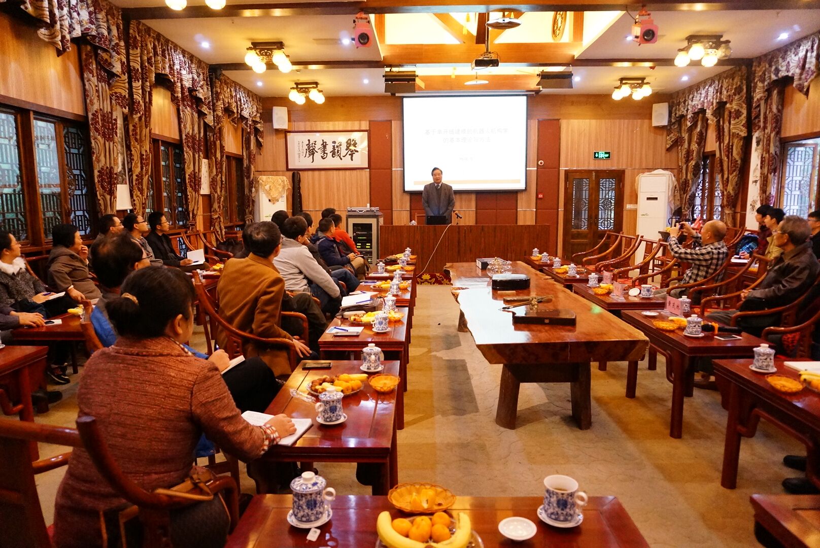 在上午的报告中,杨廷力教授全面介绍了由其独创并与其团队一起发展和完善的基于单开链建模的机器人机构学的基本理论和方法。杨教授结合自身研究感受和理论发展及完善的过程,从如何提出尺度约束类型、方位特征集和单开链三个新概念,并据此建立串联机构方位特征集方程、并联机构方位特征集方程以及机构自由度计算公式和基本运动链耦合度计算公式,详细介绍了由其独创的机器人机构拓扑结构学基本理论与方法。在此基础上,介绍了基于单开链的机器人运动学和动力学研究的一些突破性进展,并介绍了相关的研究发现对图论、消元法、集合论和几何定理机器证明等有关数学方法的拓展。杨教授的报告不光用深刻的概念、定理及方法阐述理性的学术问题,还通过个人研究的情感体验及重要论文发表过程的一些轶事讨论了科学研究中的感性思维和哲学思考。