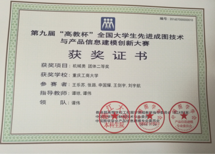 2016年7月23—26日,第九届“高教杯”全国老员工先进成图技术与产品信息建模创新大赛在山东理工大学举行,公司K1体育王乐苏、张路、申国耀、王剑宇、刘宇航等五位同学组成的代表队在谭伟、谭琼老师的指导下,荣获机械类“团体二等奖”的优异成绩,同时获得个人全能一等奖1项,个人全能二等奖2项,个人建模一等奖2项,两位老师获得优秀指导教师奖。