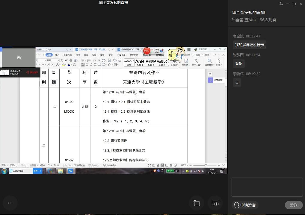 3月2号为网络授课的第一天,公司院领导和校院两级教学督导成员全部进入了所有老师的授课平台进行观摩,各课程开播基本顺利,网络条件良好,员工反响热烈。课程结束后,各位老师也在公司群分享了授课的情况和经验,确立了进一步改进的方向。