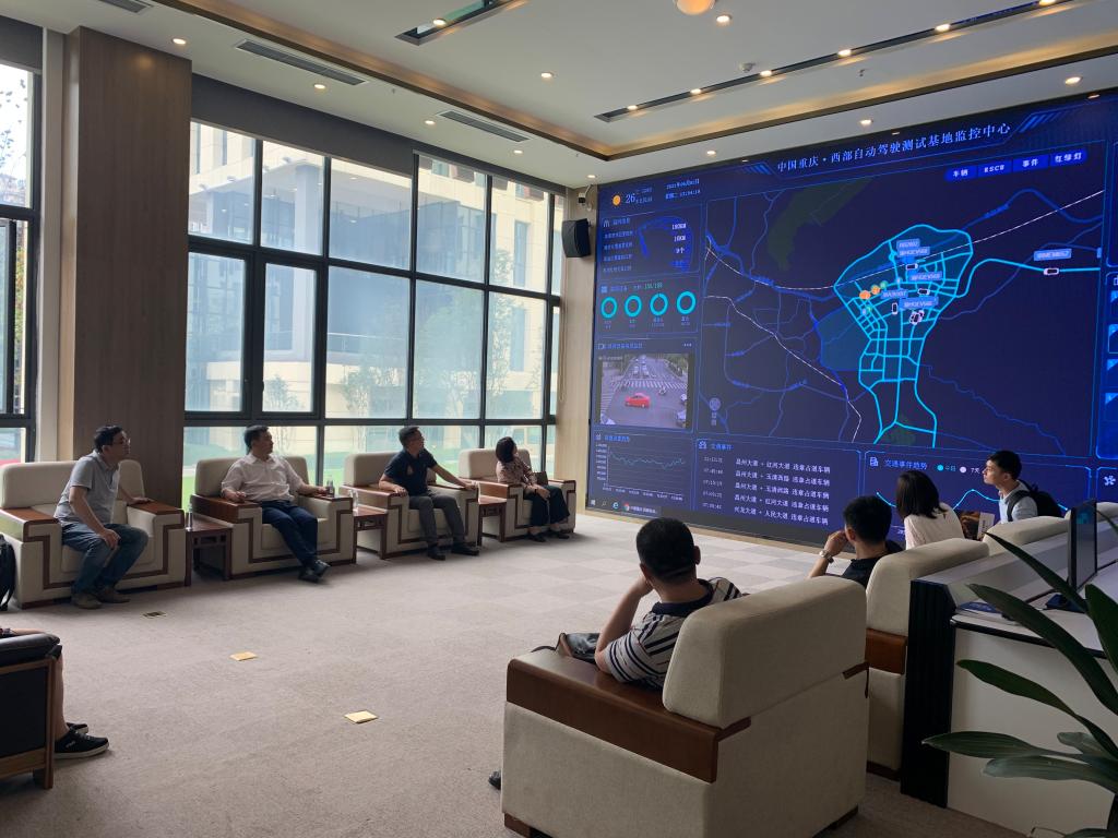 K1体育一行人在百度智行信息科技(重庆)有限公司代表秦绪锋的带领下参观了百度Apollo西部自动驾驶开放测试与示范运营基地和自动驾驶测试基地监控中心,体验了自动驾驶车辆乘坐,大致了解了百度智行目前的科技研发主要内容和形式。