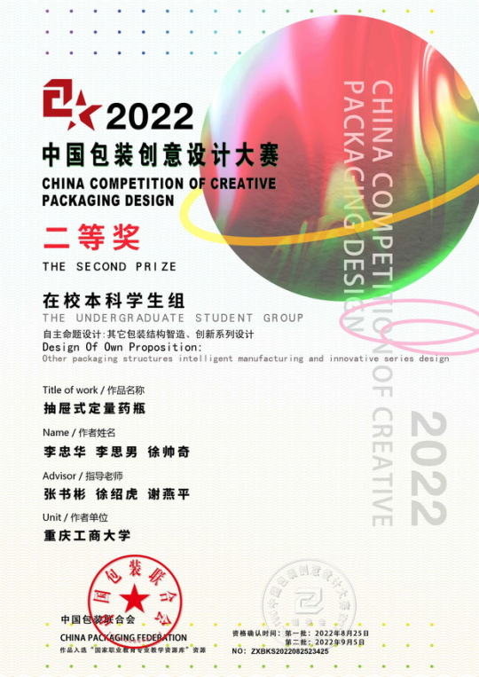 公司K1体育积极组织员工参赛,共获得二等奖1项,三等奖11项,优秀奖12项,由张书彬、徐绍虎、谢燕平指导的《抽屉式定量药瓶》获得二等奖,由谢燕平、张书彬、徐绍虎指导的《四川龙泉驿水蜜桃礼盒包装设计》等11件作品获得三等奖。